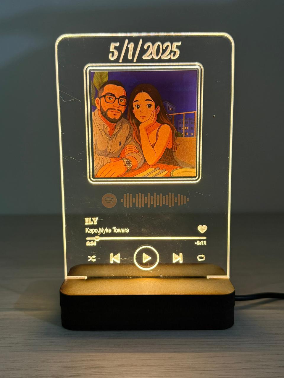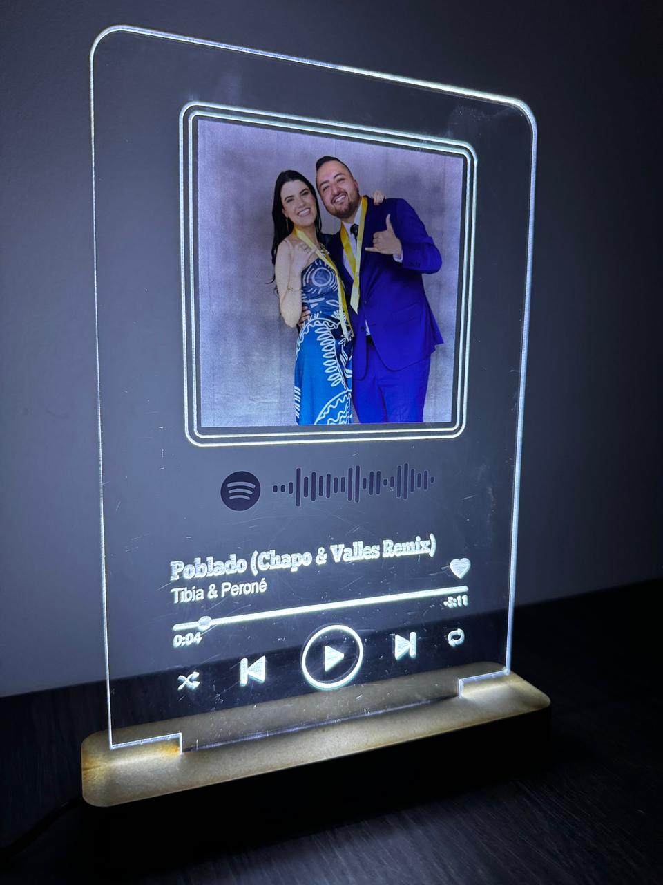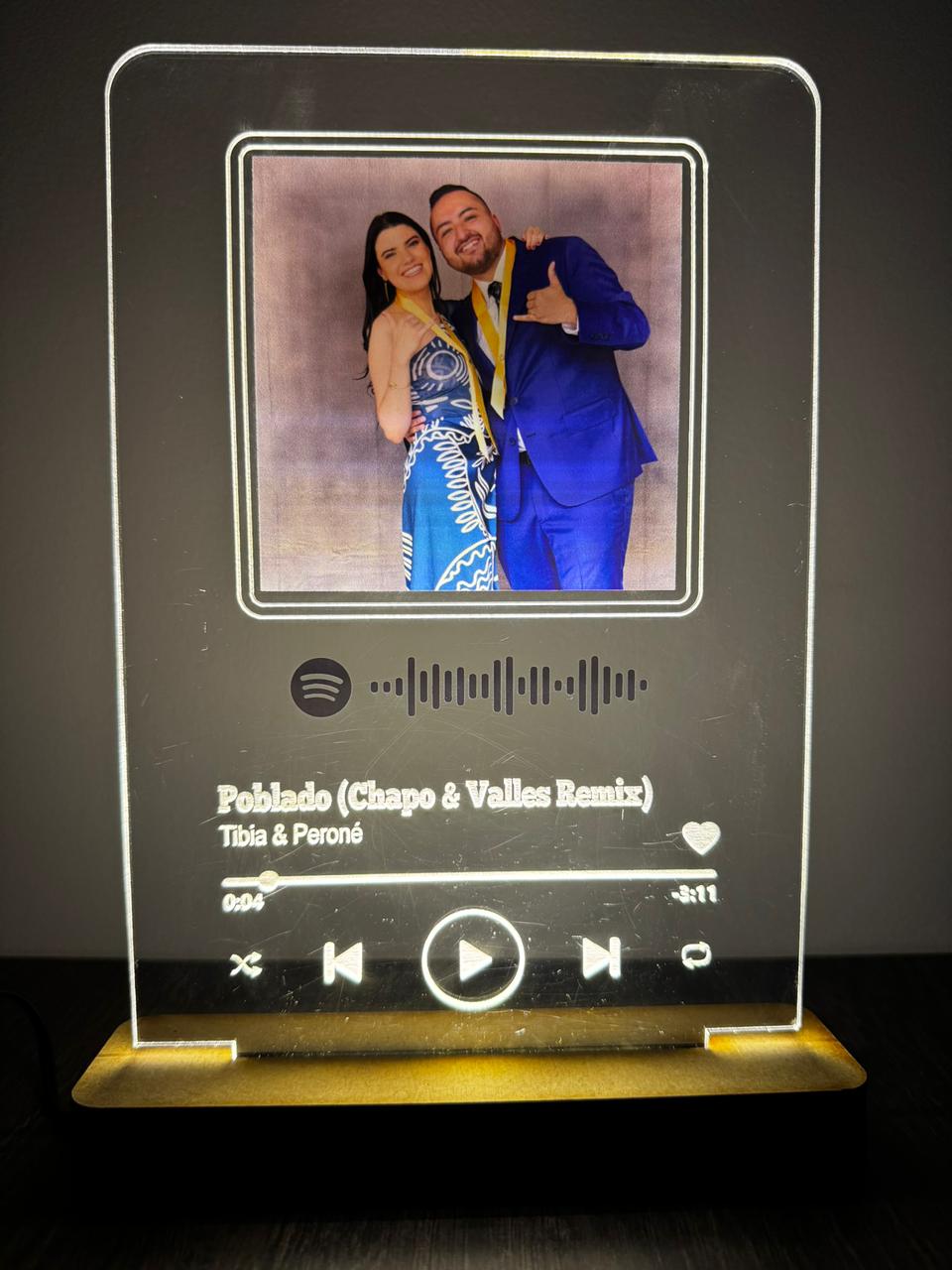 Nuestra placa Glow es el detalle perfecto para iluminar tus momentos más especiales. Diseñada en acrílico transparente con base de madera y luz LED integrada, transforma un recuerdo en una pieza única que brilla con significado.